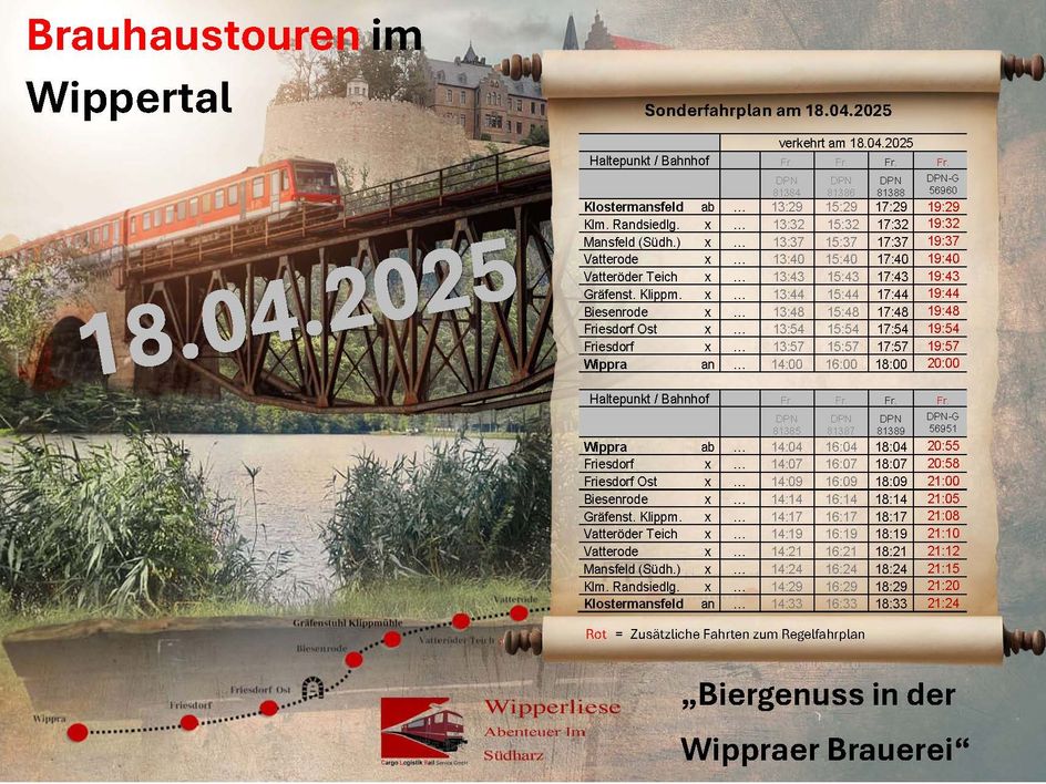 „Erleben Sie ein unvergessliches Abenteuer mit der Wipperliese zur Museumsbrauerei nach Wippra! Steigen Sie ein und lassen Sie sich von der komfortablen Wipperliese auf eine ganz besondere Reise entführen! Unsere Sonderzugfahrt bringt Sie direkt zur Museumsbrauerei nach Wippra, wo Sie in die traditionsreiche Welt des Bierbrauens eintauchen können.