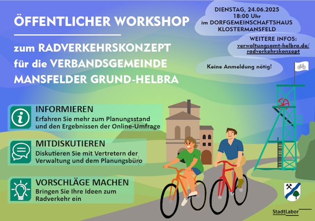 Am Dienstag, dem 24. Juni um 18:00 Uhr wird es nun einen öffentlichen Workshop im Dorfgemeinschaftshaus, Chausseestraße 29 in Klostermansfeld geben.
