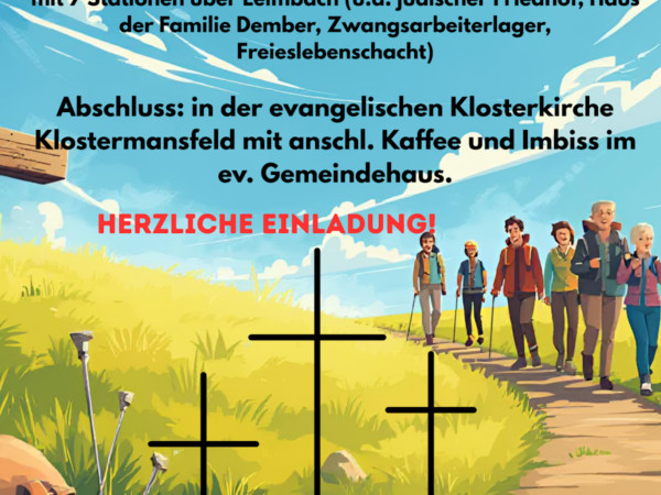 Mit 7 Stationen führt der Pilgerweg zur evangelischen Klosterkirche in Klostermansfeld mit anschließendem Kaffee und Imbiß im evangelischen Gemeindehaus.