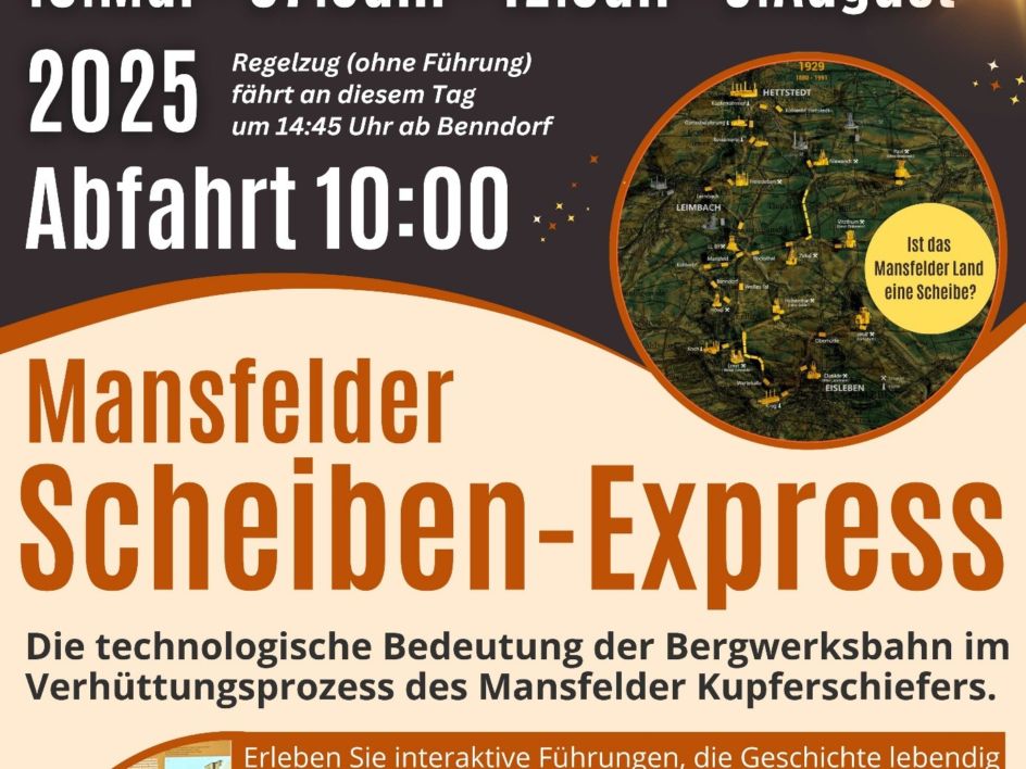 , so Marco Zeddel, Pressesprecher der Bergwerksbahn. Die Vereinsmitglieder hatten daraufhin beschlossen, dass es in der Saison 2025 einmal im Monat einen „Mansfelder-Scheiben-Express“ geben wird, der jeweils am zweiten Samstag im Monat um 10:00 Uhr in Benndorf startet und in dessen Rahmen eine Führung über das Gelände inkl. Besichtigung der Ausstellung geboten wird. Der Julitermin ist schon seit langem ausverkauft, somit ist der letzte buchbare Termin in diesem Jahr der 09. August 2025.