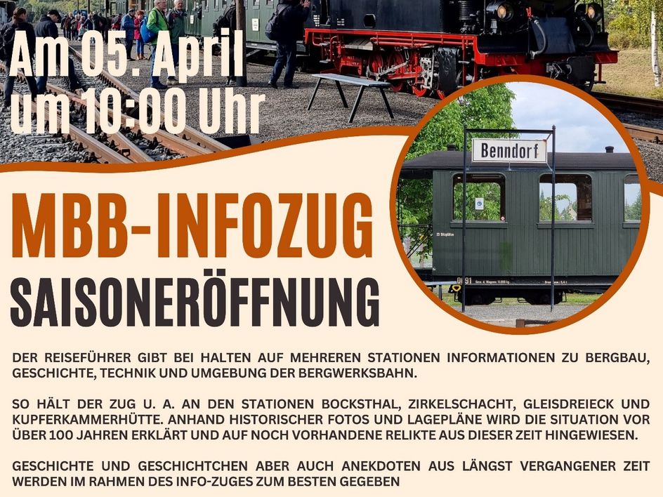 Benndorf/MBB: Die reguläre Saison der Mansfelder Bergwerksbahn startet am 05.04.2025 mit dem Info- und Regelzug. Letzterer startet ab diesem Tag bis Anfang Oktober jeden Samstag 14:45 Uhr ab Benndorf. Der Info-Zug wartet 10:00 Uhr mit Dampflok Nr. 11 auf interessierte Fahrgäste.