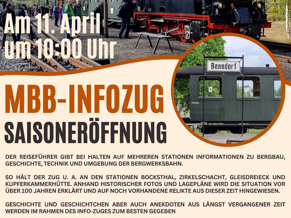 Der Info-Zug wartet 10:00 Uhr mit Dampflok Nr. 11 auf interessierte Fahrgäste. Thomas Fischer als Reiseführer gibt bei Halten auf mehreren Stationen Informationen zu Bergbau, Geschichte, Technik und Umgebung der Bergwerksbahn. So hält der Zug u. a. an den Stationen Bocksthal, Zirkelschacht, Gleisdreieck und Kupferkammerhütte. Anhand historischer Fotos und Lagepläne wird die Situation vor über 100 Jahren erklärt und auf noch vorhandene Relikte aus dieser Zeit hingewiesen.