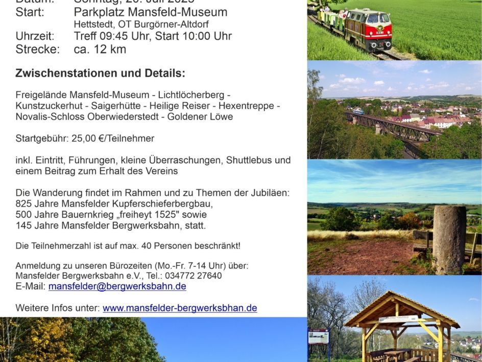 Auch 2025 hat die Mansfelder Bergwerksbahn ihr Angebot rund ums Wandern ausgebaut. In diesem Jahr stehen die Wanderungen unter den Themen der Jubiläen „825 Jahre Mansfelder Kupferschieferbergbau“, „500 Jahre Bauernkrieg Freyheit 1525“ und „145 Jahre Mansfelder Bergwerksbahn“.