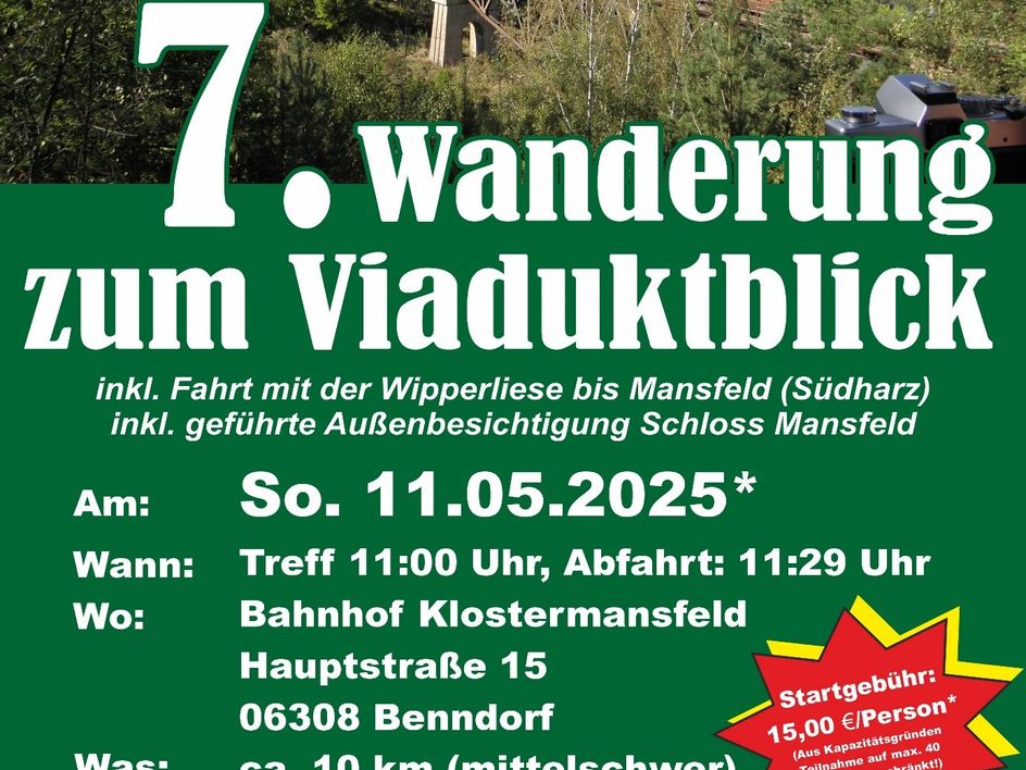 Die Tour startet 11:29 Uhr mit einer kurzen Fahrt mit der Wipperliese bis Mansfeld (Südharz) dann geht die Wanderung zuerst zum Viaduktblick, wo die Teilnehmer bei hoffentlich guter Sicht einen Blick auf dieses imposante Bauwerk werfen können.