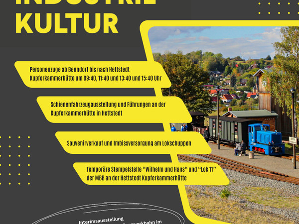 Am Sonntag, den 12.04.2026 nimmt die Mansfelder Bergwerksbahn aktiv mit einem umfangreichen Angebot und Programm für interessierte Besucher teil. Die Bergwerksbahner haben für die Teilnahme am Tag der Industriekultur das Gelände Kupferkammerhütte ausgewählt, da es hier viel Geschichte zum Thema Industriekultur gibt. Die Vereinsmitglieder bieten Führungen auf dem Gelände der ehemaligen Kupferkammerhütte und im Lokschuppen der Bergwerksbahn in Hettstedt an.