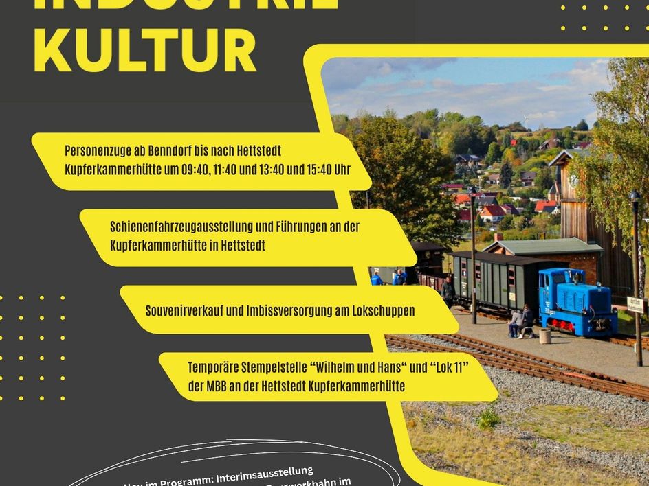 Die Vereinsmitglieder bieten Führungen auf dem Gelände der ehemaligen Kupferkammerhütte und im Lokschuppen der Bergwerksbahn in Hettstedt an. Dazu fahren Zubringerzüge ab Benndorf um 9:40 Uhr, 11:40 Uhr, 13:40 Uhr und 15:40 Uhr zur Kupferkammerhütte und zurück.