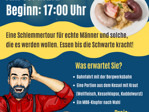 Im späten Winter dieses Jahres geht es – wie bereits schon 2018 und 2024 – wieder mit dem historischen Reisezug zum Schlachtefest. Mit Wellfleisch, Kochklöpsen und Kuddelwürsten werden hier die Fahrgäste am Freitag, 13.03.2026 durch die Bergwerksbahner nach alter Mansfelder Tradition aus dem Kessel beköstigt.