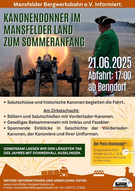 In Zusammenarbeit mit dem Schützenverein Mansfelder Land e.V. und vielen weiteren Freunden des Schwarzpulver- und Vorderlader-Kanonenschießens aus Nah und Fern wird es am längsten Tag des Jahres, dem 21.06.2025, den ersten „Kanonenzug“ unter dem Motto „Kanonendonner im Mansfelder Land“ bei der Mansfelder Bergwerksbahn geben.