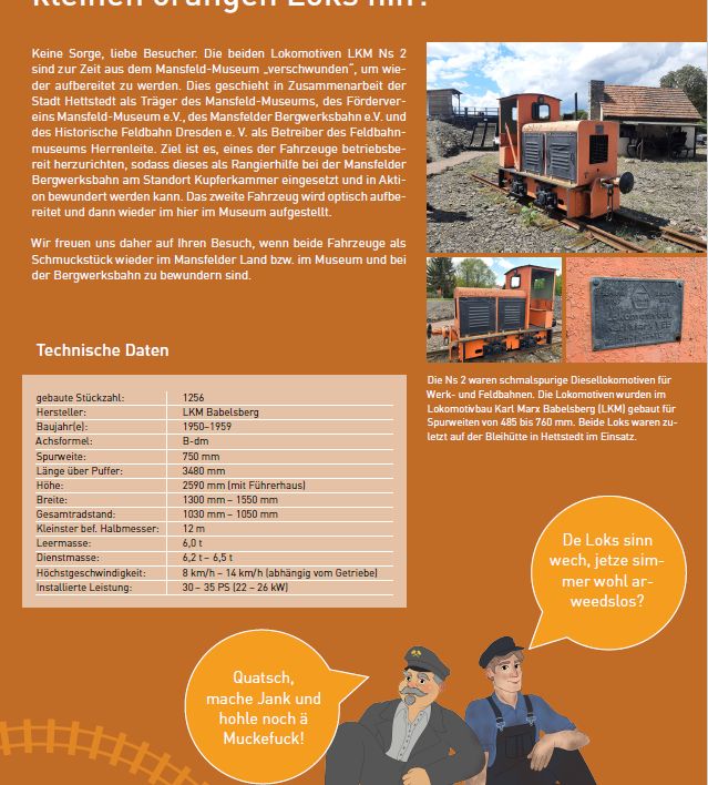 Wir freuen uns daher auf Ihren Besuch, wenn beide Fahrzeuge als Schmuckstück wieder im Mansfelder Land bzw. im Museum und bei der Bergwerksbahn zu bewundern sind.