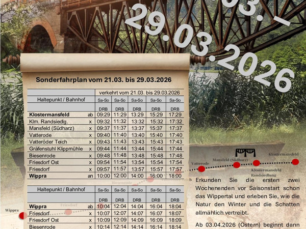 Gemütlich rollt der traditionsreiche Triebwagen durch die erwachende Natur des Wippertals. Saftige Wiesen, blühende Obstbäume und das sanfte Plätschern der Wipper begleiten die Fahrgäste auf einer nostalgischen Reise durch eine der schönsten Landschaften Sachsen-Anhalts.