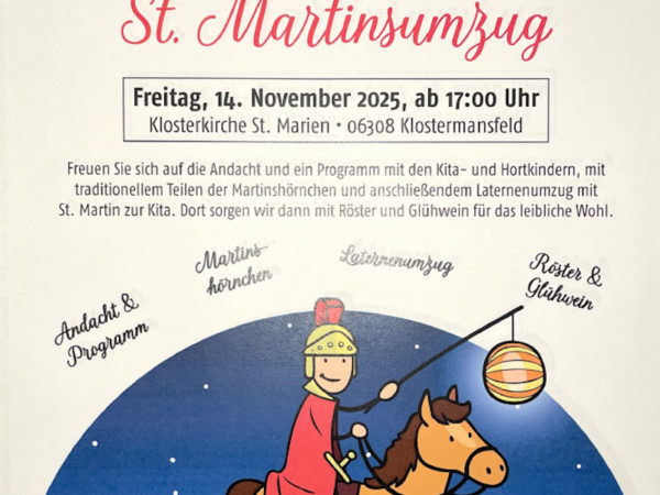 Freuen Sie sich auf die Andacht um 17 Uhr und ein Programm mit den KITA- und Hortkindern, mit traditionellem Teilen der Martinshörnchen und anschließendem Laternenumzug mit St. Martin zur KITA. Dort sorgen wir dann mit Röster und Glühwein für das leibliche Wohl.