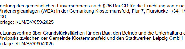 Tagesordnungspunkt 12 behandelte einen durch die Stadt Mansfeld beschlossenen neuen Windpark, durch den Lasten auf ein Grundstück der Gemeinde Klostermansfeld fallen.